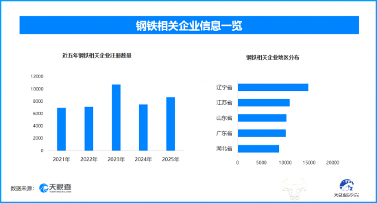 天眼查专业版数据显示,截至目前我国现存在业、存续状态的钢铁相关企业超10.5万家。其中,2025年新增注册相关企业约8600余家,从企业注册数量趋势来看,钢铁相关企业的注册数量平稳发展,其中在2023年达到历史峰值,为超1.07万家。