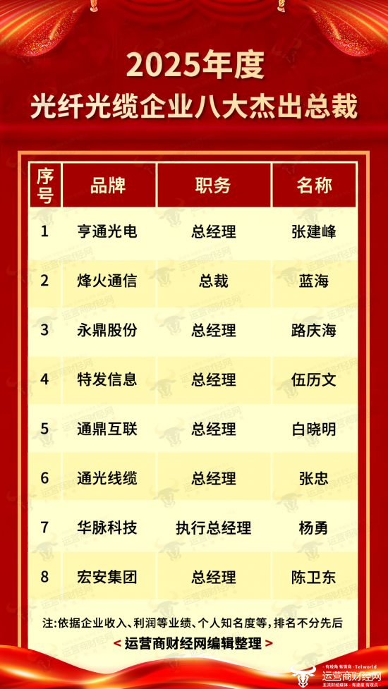 近日,运营商财经网基于对通信设备行业的整体观察,推出“2025年度光纤光缆企业八大杰出总裁”榜单,旨在对2025年度市场表现优异的企业管理者进行表彰。