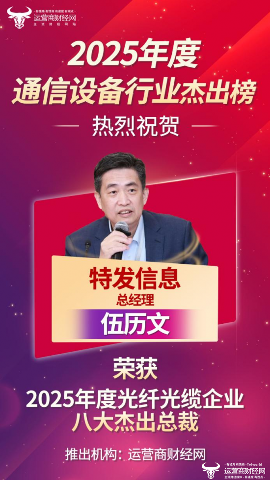 近日,通信行业权威媒体——运营商财经网正式公布“2025年度光纤光缆企业八大杰出总裁”榜单,上榜的均为行业内的佼佼者。其中,特发信息总经理伍历文成功入选,这是对其过去一年企业贡献的认可。