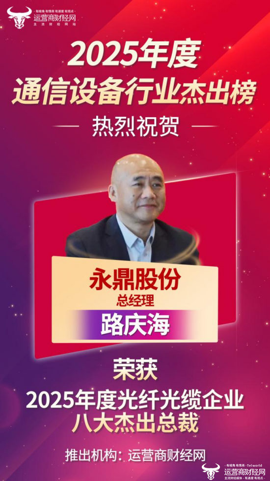 近日,运营商财经网综合多维度标准,评选出“2025年度光纤光缆企业八大杰出总裁”,上榜的均为行业内的佼佼者。其中,永鼎股份总经理路庆海榜上有名。
