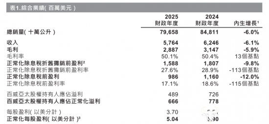 具体来看,百威亚太2025年收入为57.64亿美元,约为人民币397.78亿元,同比减少6.1%,公司股权持有人应占溢利由2024年的7.26亿美元下降至2025年的4.89亿美元,约合109.59亿元人民币,同比大幅下降32.6%,创百威亚太上市以来的历史新低,总销量也同比减少了6.0%至796.58万千升。