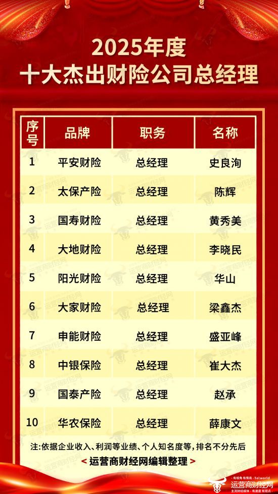近期,国内知名财经媒体——运营商财经网打造的2025年度金融企业杰出榜,涉及范围广泛,引起业内外广泛关注。日前,由运营商财经网独家打造的“2025年度十大杰出财险公司总经理榜”正式出炉!都有哪些高管入围?