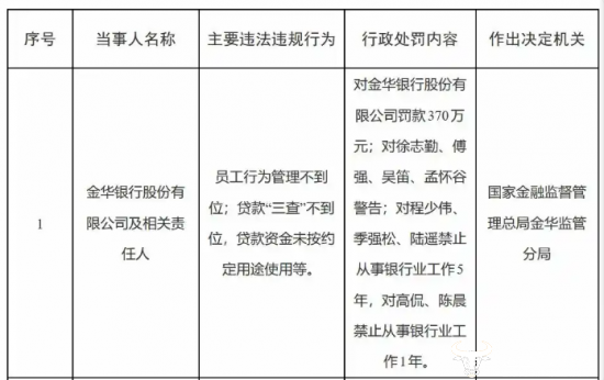 具体来看,金华银行因员工行为管理不到位;贷款“三查”不到位,贷款资金未按约定用途使用等违法违规行为,被国家金融监督管理总局金华监管分局罚款370万元。