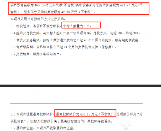 有意思的是,招标公告显示,该项目的预算金额及最高限价均为466.15万元(不含税),中标人数量为1个。