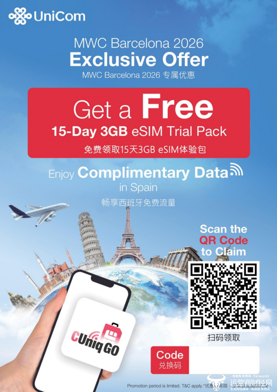 全球移动通信行业盛会MWC Barcelona 2026即将于3月2日至5日在西班牙巴塞罗那举行。中国联通宣布,将在展会期间向所有与会者赠送专属福利:免费领取中国联通CUniq西班牙eSIM流量包3GB,让每一位亲临现场的嘉宾都能畅享便捷、高速的本地上网服务。