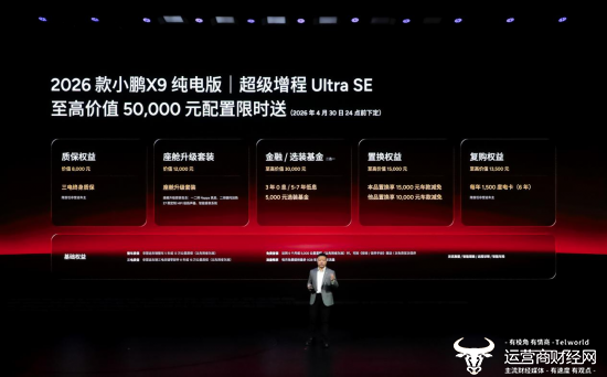 即日起至2026年4月30日24点(含)前下定2026款小鹏X9纯电版,可享最高价值50,000元 权益限时送,包含三电终身质保、价值12,000元的座舱升级套装、至高价值30,000元金融/选装基金、至高价值15,000元置换权益以及每年1500度电卡(6年)的复购权益。2026款小鹏X9超级增程权益与2026款纯电版权益一致(2026年3月31日24:00前下定),此外24和25款的小鹏X9车主置换26款小鹏X9可以获得额外1万元的代金券补贴。(2025年11月20日已发放)