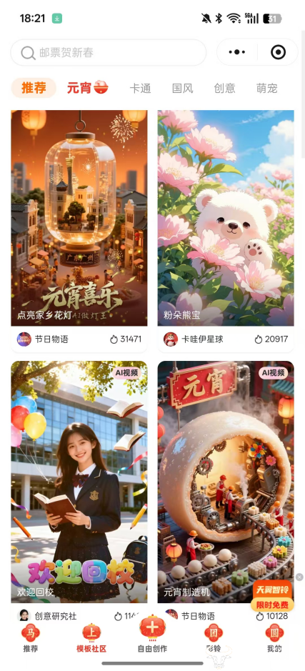 微信搜索并打开“天翼智铃”小程序,海量模板库任你挑选:国潮风韵、萌宠治愈、卡通趣味……风格百变,总有一款击中你的“心巴”。更有马年专属、元宵主题创意模板扎堆上线,花灯映月、汤圆滚滚、阖家团圆等元宵经典元素氛围感拉满。一键复制模板即可快速使用,也能随心修改文案,轻松打造贴合节日氛围的专属彩铃,让来电等待瞬间充满新春元宵的喜庆气息,创作门槛一降再降,人人都能轻松上手!