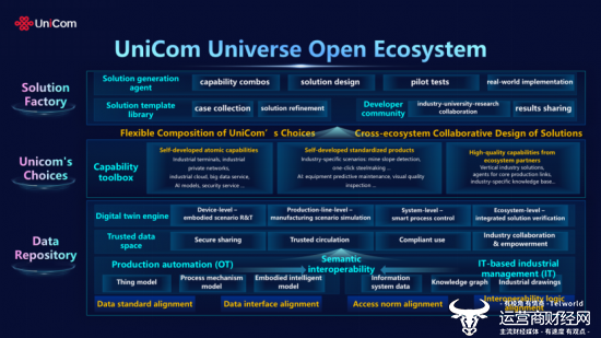 发布会上,中国联通正式发布Universe生态开放平台。该平台由“数据底仓”“联通优选”“解决方案工厂”三大模块构成,旨在实现数据要素安全流通、数智能力一体聚合与解决方案协同编排,推动跨界融合与生态共创。