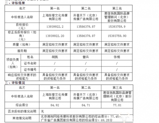 或许是对于两大实力企业的信赖和巨大金额的吸引,业内不少知名公关公司都来参与投标,包括上海际享文化传媒有限公司、开普天下(北京)传媒广告有限公司、君信扬凯国际品牌管理顾问(北京)股份有限公司、北京朗知网络传媒科技股份有限公司、广东省广告集团股份有限公司等。