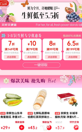 为了给女性消费者带来更多节日惊喜,今年三八妇女节期间,京东生鲜以“鲜力全开,许她耀眼”为主题,倾情推出“满99享8折、满199打6.5折”等专属福利,多款爆款生鲜直接低至5.5折,更有广州酒家牛乳小米糕、陶陶居早餐组合、思念柿柿如意汤圆等“美味一分试吃”活动,为节日增添更多甜蜜滋味。即日起,打开京东APP,搜索“生鲜38节”,即可一站式选购“又好又便宜”的生鲜好物,收获属于你的节日惊喜。