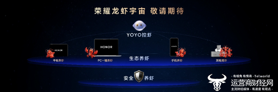 发布会上,还公布了生态级的荣耀龙虾宇宙,支持PC一键养虾、平板养虾,未来还能兼容其他生态设备的龙虾接入。用户可以通过YOYO在荣耀手机上直接和小龙虾交互,并安全地开放手机智能体供小龙虾调用,实现生态养虾、安全养虾和YOYO控虾三大能力。这些功能将于近期陆续开放内测。