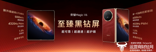 荣耀Magic V折叠屏系列自诞生之日起,就在不断刷新折叠行业品类上限。此次荣耀Magic V6不仅在极致轻薄上持续引领,更首次将折叠屏电池容量带入7000+mAh时代,续航实力跨代领先。内外均采用荣耀自研至臻黑钻屏,国际顶级七大权威认证诠释顶级屏幕素质。全新荣耀盾构钢铰链和超强整机防尘防水,将可靠性拉满。同时,凭借满血性能和出色影像配置,以及全新AI生产力和跨生态互联体验,带来从内核到外观,从硬件到软件的“折叠屏大满贯”实力。