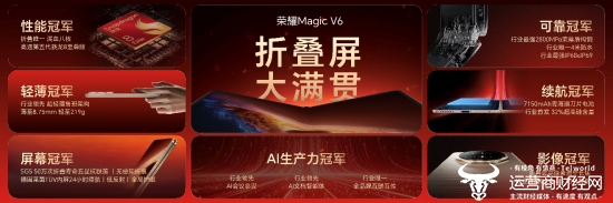 凭借荣耀在折叠屏上的突破性技术创新,荣耀Magic V6实现了屏幕、可靠、轻薄、续航、性能、影像、AI生产力七大维度夺冠,无论硬件实力还是软件体验,均实现全维度拉满,铸就折叠屏全能大满贯。