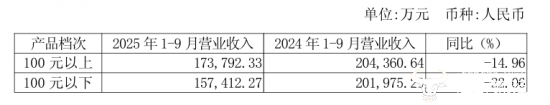 而在2025年前三季度,老白干酒实现营业收入33.30亿元,同比下降18.53%,归母净利润为4.00亿元,同比下降28.04%。其中100元以上的产品在2025年前三季度收入为17.38亿元,同比下降14.96%,100元以下的产品收入同比减少22.06%至15.74亿元,两大产品类型均有所下降,但营收规模比较接近。