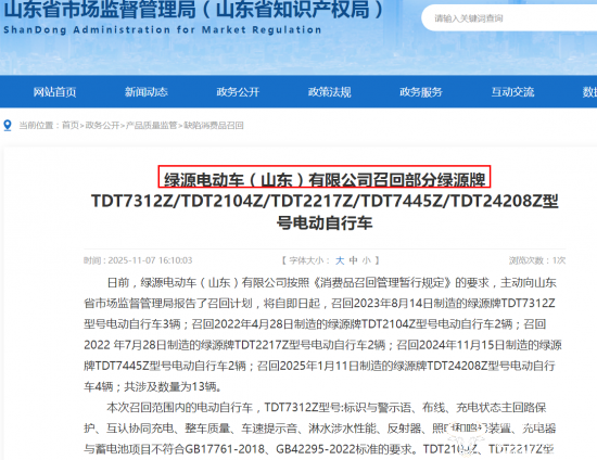 据山东省市场监督管理局在2025年11月发布的公告显示,绿源电动车(山东)有限公司主动召回多型号电动自行车,共涉及数量为13辆。