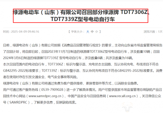 这并不是绿源在2025年首次召回不合格产品了,在同年4月份绿源电动车(山东)有限公司就曾召回部分绿源牌两种型号共计16辆车。