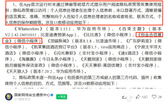 在国家网络安全通报中心发布的通报中,《创金合信基金》(微信小程序)存在“在App首次运行时未通过弹窗等明显方式提示用户阅读隐私政策等收集使用规则;隐私政策难以访问;个人信息处理者在处理个人信息前,未以显著方式、清晰易懂的语言真实、准确、完整地向个人告知个人信息处理者的名称或者姓名、联系方式、个人信息的保存期限等”等多项违规行为,被点名。