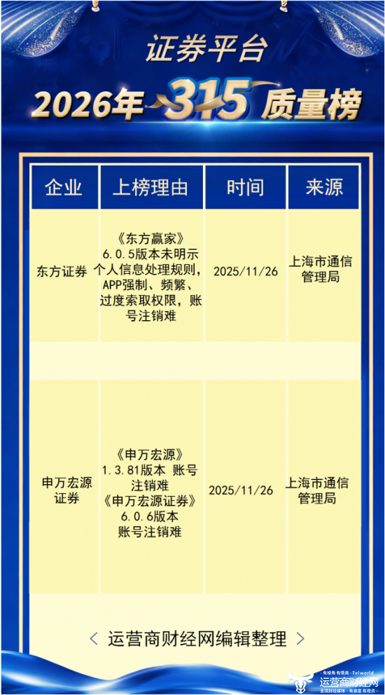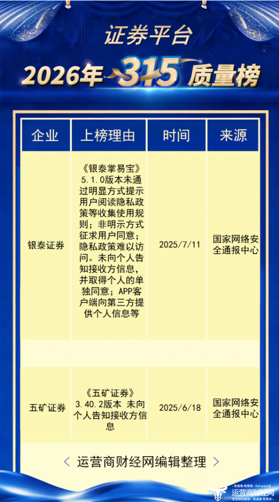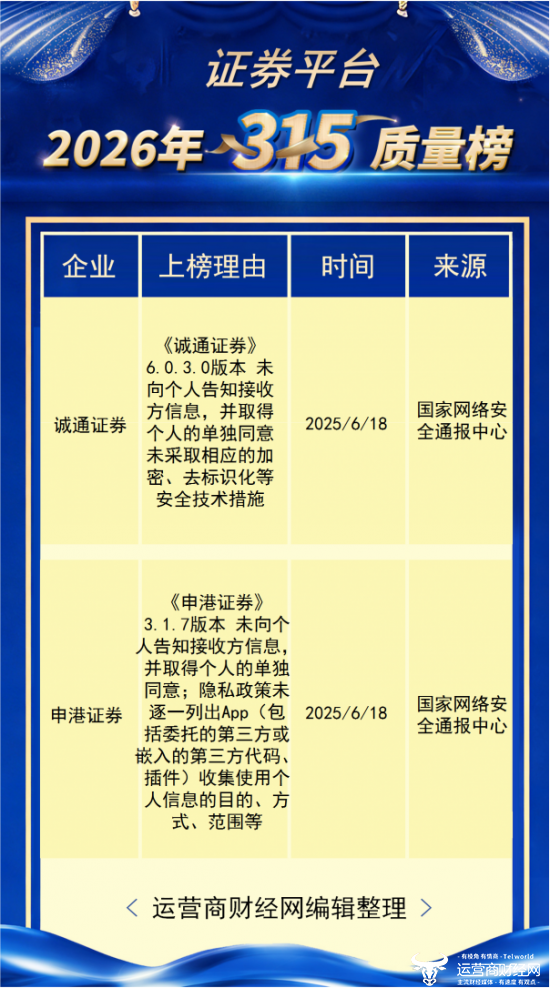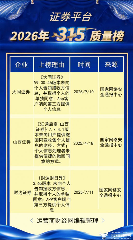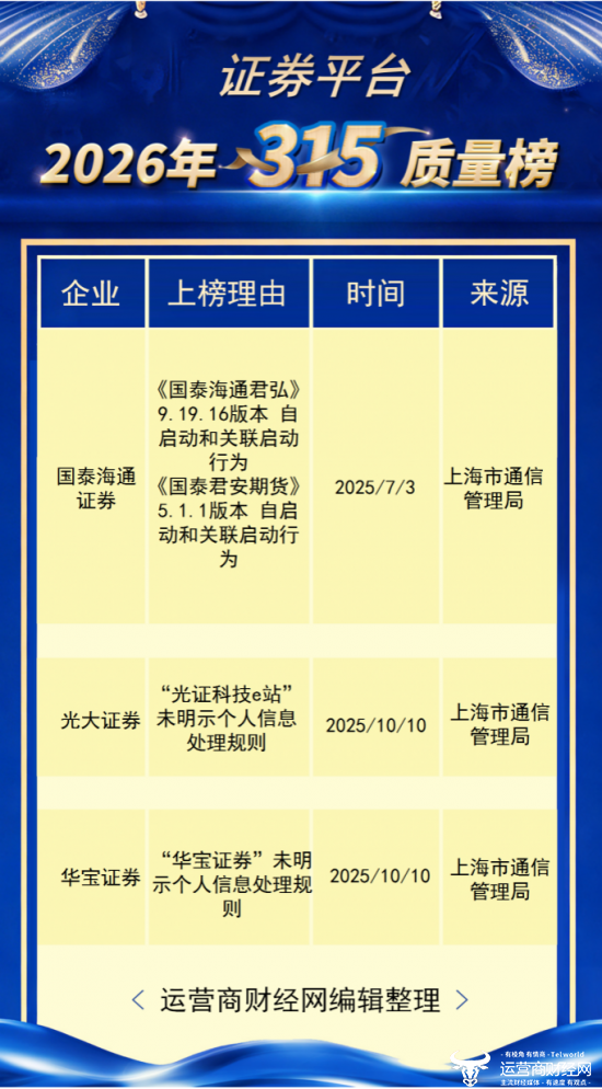 恰逢一年一度的315消费者权益日,运营商财经网对过去一年中,金融各领域存在的侵害消费者权益问题和现象进行了梳理。针对券商行业,推出了“运营商财经网2026年315证券平台侵犯用户隐私榜”。多家公司因旗下互联网平台出现违规行为而被点名。