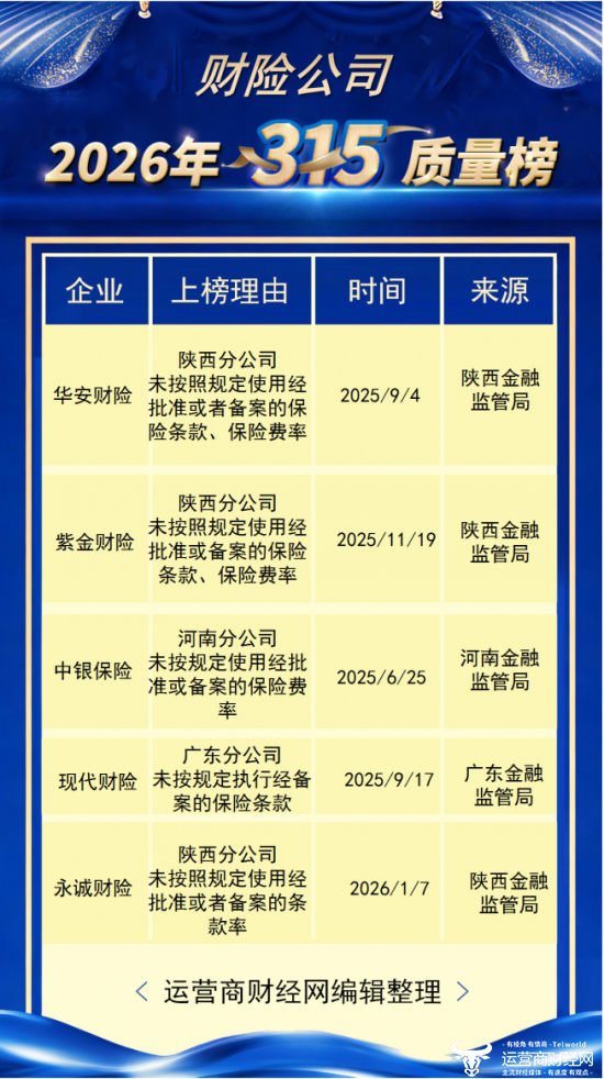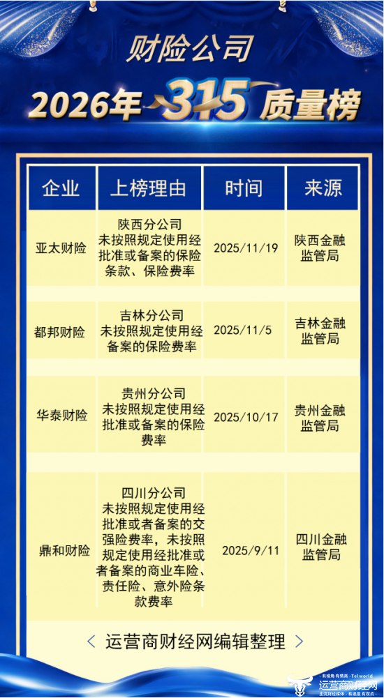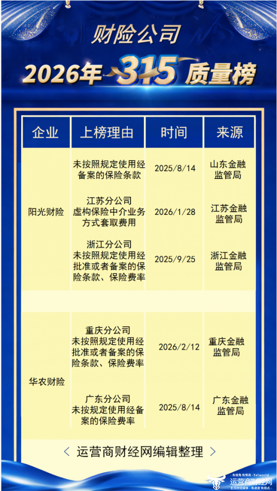 日前,运营商财经网梳理了过往一年财险公司侵犯消费者权益的案例,来源均出自官方权威机构,整理推出了“运营商财经网2026年315财险公司侵犯消费者知情权和决策权榜”。恰逢3·15国际消费者权益日,也为消费者梳理了一份榜单。