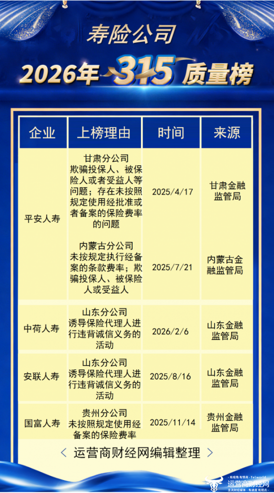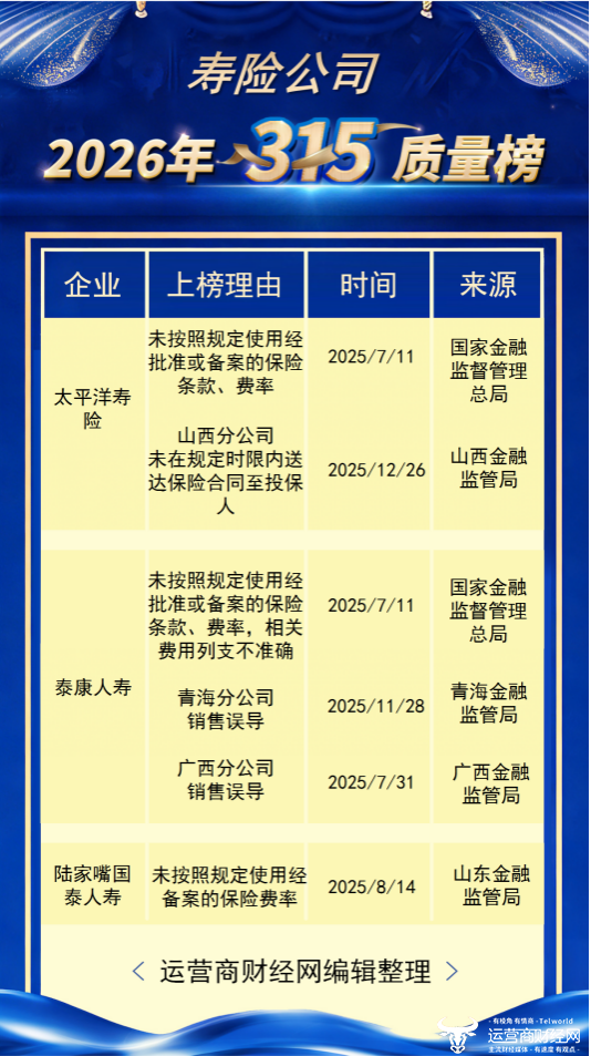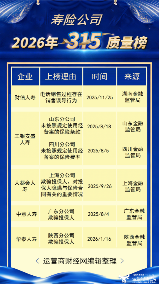在一年一度的3·15国际消费者权益日,运营商财经网推出了“运营商财经网2026年315寿险公司侵犯消费者知情权和决策权榜”。运营商财经网梳理了过往一年中,寿险公司侵犯消费者权益的案例,来源均出自官方权威部门。