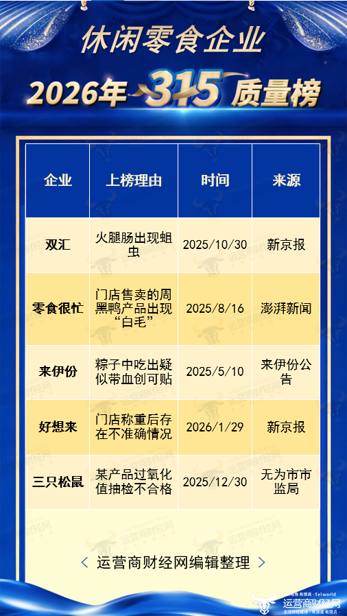 但无论销售渠道如何变化,休闲零食行业都是每年315的重中之重,因为它本身与食品安全问题息息相关,不仅关系到消费体验,更直接关系到消费者的身体健康。因此,运营商财经网聚焦过往一年中零食行业的热点事件与知名企业,推出了“休闲零食产品异物榜”。