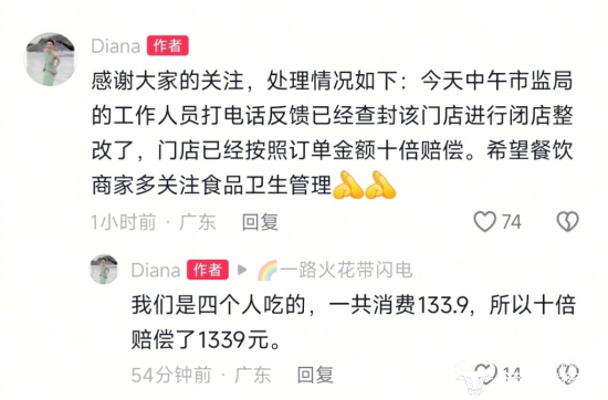 消费者随后补充称,其合计在涉事门店共消费133.9元,涉事门店按照10倍赔偿,赔付了1339元。