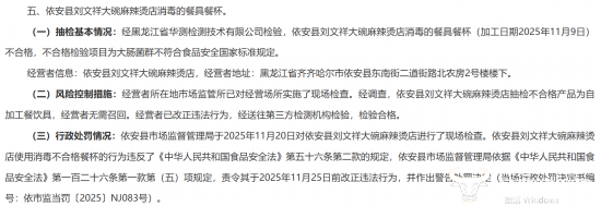 此外,据依安县市场监督管理局通报,2025年11月20日对依安县刘文祥大碗麻辣烫店进行了现场检查,发现其消毒餐具大肠菌群超标,不符合食品安全国家标准规定。依安县市场监督管理局责令其改正违法行为,并作出警告处罚决定。