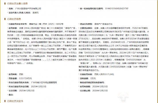 据国家企业信用信息公示系统显示,2025年12月23日,旭广州兴胜房地产开发有限公司开发的“旭辉曜玥湾”项目,因在售楼过程中宣传“九年一贯制学校”相关内容,涉嫌虚假宣传,被广州市南沙区市场监督管理局予以处罚。