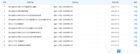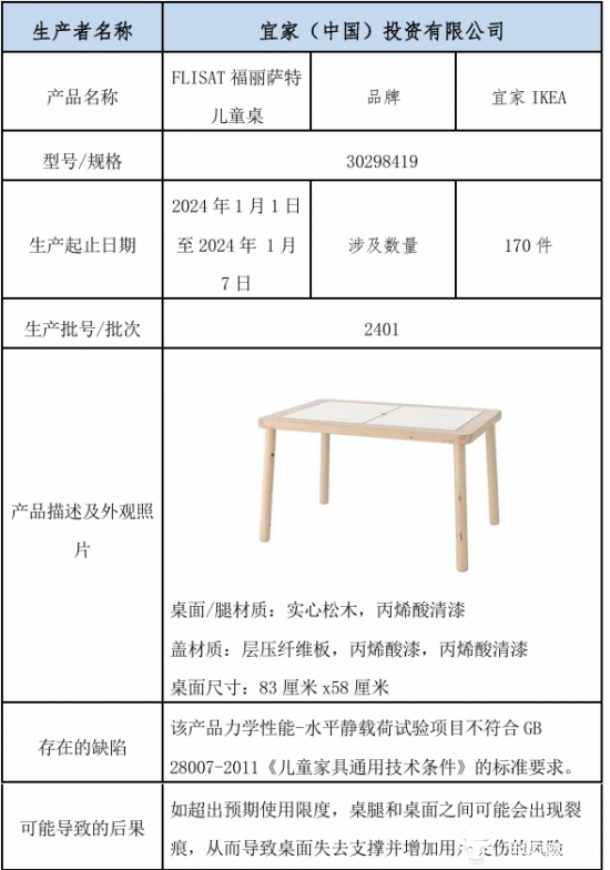 2025年11月,上海市场监管局官方微信发布公告称,宜家(中国)投资有限公司召回2024年1月1日至2024年1月7日生产的宜家IKEA牌FLISAT福丽萨特儿童桌,共计170件。