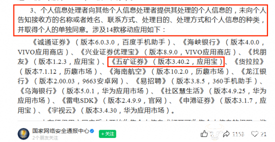 国家网络安全通报中心根据相关法律法规和公告要求,国家计算机病毒应急处理中心对市场移动应用进行检测。五矿证券旗下的《五矿证券》(版本3.40.2,应用宝)被通报。