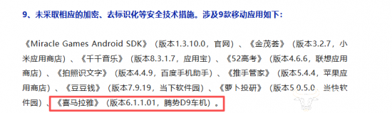 据国家网络安全通报中心去年5月发布的通告,来自腾势D9车机的《喜马拉雅》(版本6.1.1.01)存在隐私政策未逐一列出App(包括委托的第三方或嵌入的第三方代码、插件)收集使用个人信息的目的、方式、范围等;未向用户提供撤回同意收集个人信息的途径、方式;未提供便捷的撤回同意方式。以及未采取相应的加密、去标识化等安全技术措施。