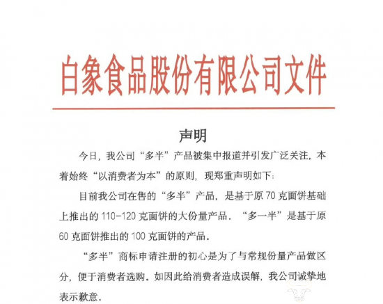 6月 4日,白象食品发布声明称,目前我公司在售的“多半”产品,是基于原70克面饼基础上推出的110-120克面饼的大份量产品。“多一半”是基于原60克面饼推出的100克面饼的产品。“多半”商标申请注册的初心是为了与常规份量产品做区分,便于消费者选购。