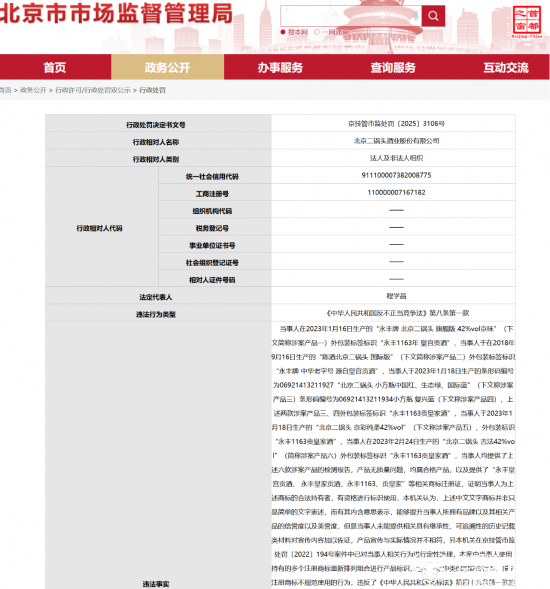 2025年10月23日,北京二锅头酒业股份有限公司因违反反不正当竞争法,被北京经济技术开发区管理委员会罚款1.5万元。