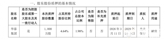 公告显示,洽洽食品控股股东合肥华泰集团股份有限公司,将其持有的1000万股公司股份质押给了中国光大银行股份有限公司合肥分行,质押用途为融资。