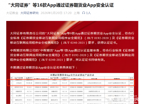 “大同证券研究”官微在今年1月20日曾发布过一篇文章,表示公司“大同证券”Android V9.00.49版本已经通过证券期货业APP安全认证,符合行业标准规范要求,并获得认证证书。