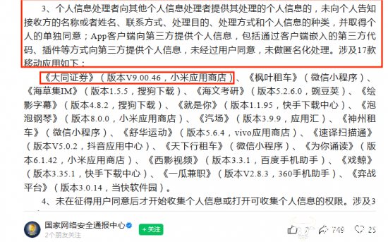 在国家网络安全通报中心发布的通报中,大同证券旗下的《大同证券》(版本V9.00.46,小米应用商店),存在违法违规收集使用个人信息情况,被通报。