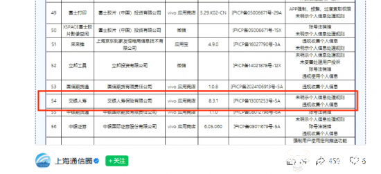 根据上海市通信管理局发布的通报,交银人寿旗下的“交银人寿”vivo应用商店8.3.1版本,存在“未明示个人信息处理规则”“违规收集个人信息”的违法违规行为,被点名通报。
