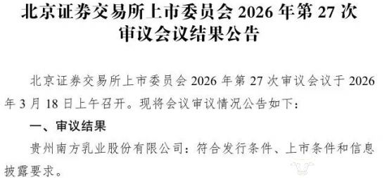 公告显示,北京证券交易所上市委员会2026年第27次审议会议于2026年3月18日上午召开,审议结果为,贵州南方乳业股份有限公司符合发行条件、上市条件和信息披露要求。这也意味着,南方乳业或将成为继骑士乳业后,第二家在北交所上市的乳企。