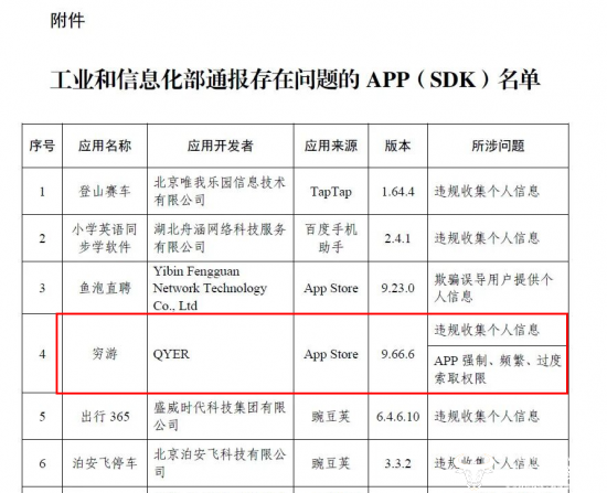 据工信部3月13日发布的相关公告显示,穷游APP存在“违规收集个人信息,APP强制、频繁、过度索取权限”两项问题被通报。同时公告点名,上述APP及SDK应按有关规定进行整改,整改落实不到位的,将依法依规组织开展相关处置工作。
