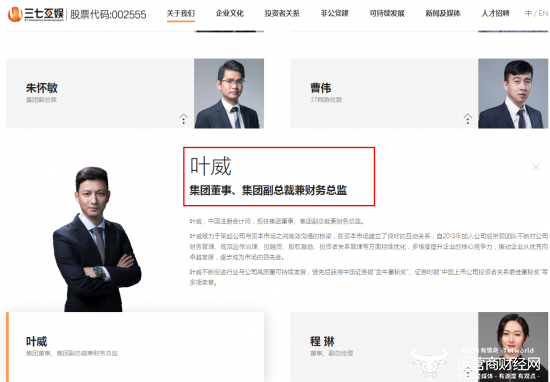 随后,在三七互娱集团官网上,叶威的职务就变更为副总裁兼财务总监。从表面来看,叶威似乎还升职了。值得一提的是,在叶威职务变动的同一天,集团副总朱怀敏也因工作变动辞去相关职务了,但集团官网上他的信息仍是副总。