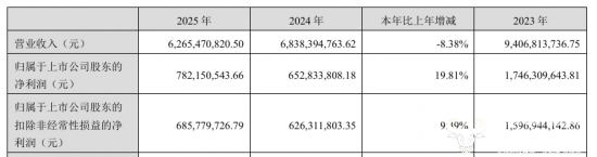 汤臣倍健披露的2025年年报显示,公司2025年实现营业收入62.65亿元,同比下降8.38%,连续第二年出现收入规模下降,但归母净利润同比增长19.81%至7.82亿元。