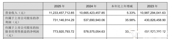 年报数据显示,新希望乳业2025年全年实现营业收入112.33亿元,同比增长5.33%,再创历史新高,归母净利润为7.31亿元,同比增长35.98%,营收和净利润双双上涨,扭转了2024年公司增利不增收的情况。
