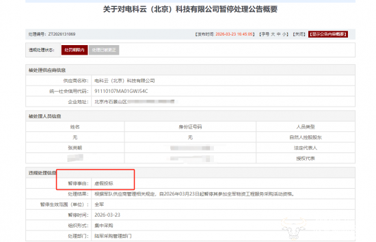 2026年3月23日,某系统采购网发布《关于对电科云(北京)科技有限公司暂停处理公告》,公告显示,电科云(北京)科技有限公司在参加项目编号:2025-JL02-W1002采购活动中,涉嫌存在违规失信行为。