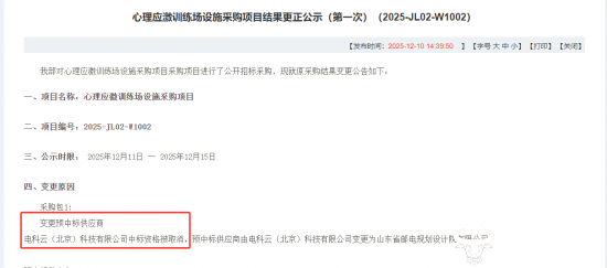 天眼查招投标情况显示,上述项目是心理应激训练场设施采购项目,2025年7月发布结果公告,预中标供应商是电科云,报价金额是5710039元。同年12月,该项目结果更正,电科云中标资格被取消。