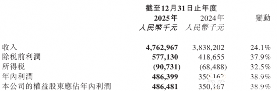 绿茶集团披露的2025年年度业绩报告显示,集团2025年营业收入约为47.63亿元,较2024年的38.38亿元增长24.1%,年内利润约为4.86亿元,同比增长38.9%。而毛利率却由2024年的68.92%下降至68.33%,但仍处于行业中较高水平。