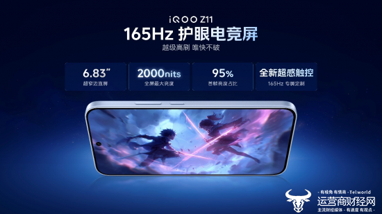 iQOO Z11 搭载 6.83 英寸 iQOO 首款 165Hz 护眼电竞屏,拥有专为 165Hz 优化的全新超感触控、更低拖影的 95% 首帧亮度占比、2000nits 全屏最大亮度,以及 600nits 下的更低功耗,还支持 2160Hz 高频 PWM 融合调光和全亮度类 DC 调光,搭载游戏护眼 2.0,并通过 SGS 低蓝光认证和 SGS 低频闪认证,以及全家桶护眼方案呵护用户双眼。