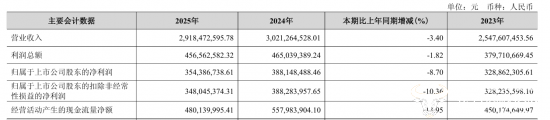 金徽酒披露的2025年年度报告显示,公司2025年实现营业收入29.18亿元,同比微降3.4%,归母净利润达到3.54亿元,同比下降8.7%,营收和利润均略微下降,这也是其上市以来首次出现营利双降的情况,在白酒行业中算是降幅很小的,其实业绩还算不错。