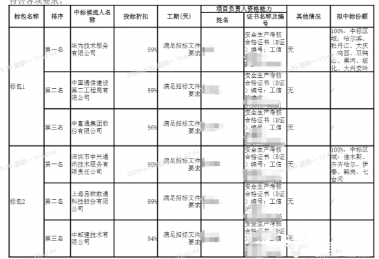 标包1中,三家中标候选人分别是华为技术服务有限公司、中国通信建设第二工程局、中富通集团,报价差距不大,除中富通集团投标折扣为96%外,另两家折扣均为99%。