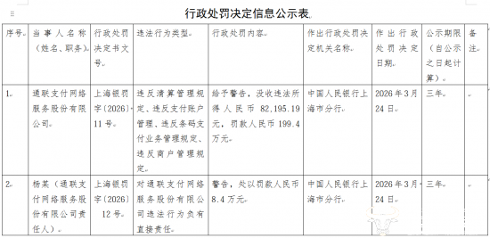 除此之外,通联支付责任人杨某因对上述违法行为负有直接责任,被警告,并处以罚款8.4万元。通联支付目前暂未对被罚一事作出回应。
