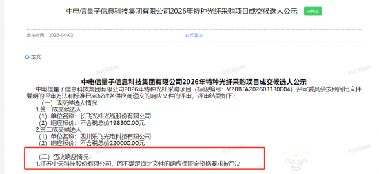 近日,中电信量子信息科技集团2026年特种光缆采购项目公示成交候选人,有一家知名企业被否决应答,具体是什么情况?